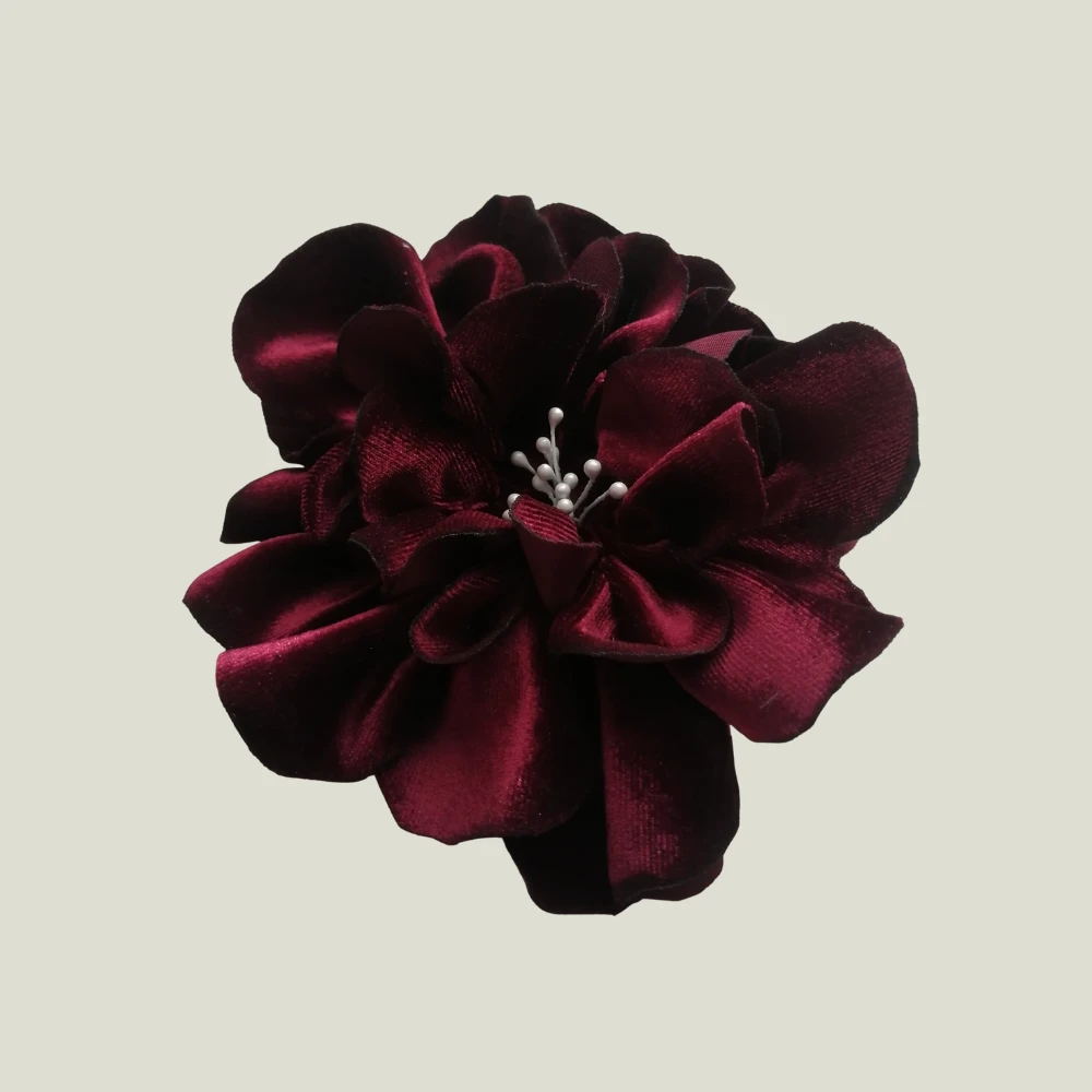 Esta flor artesanal en terciopelo color bordó destaca por su elegancia y presencia, convirtiéndose en un accesorio único que aporta sofisticación a cualquier look. Cada pétalo ha sido cuidadosamente moldeado a mano, logrando un volumen natural y un acabado exquisito que resalta la textura suave y luminosa del terciopelo.