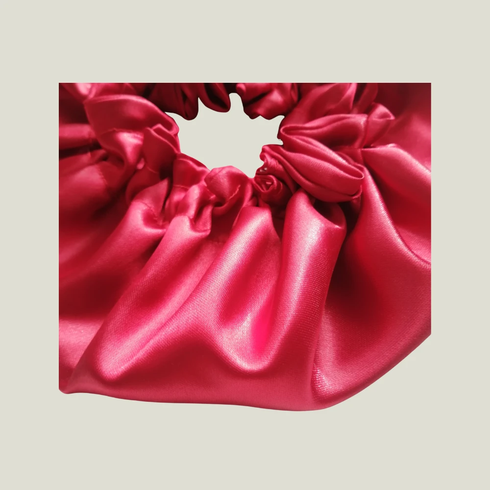 Tela satinada con brillo que proporciona beneficios para el cuidado del cabello, fresco, cómodo de varios tamaños de acuerdo a cada volumen o proporción del cabello. Presenta un diseño voluminoso y fruncido, entregando un aspecto ornamental con pliegues generando un estilo delicado y romántico.